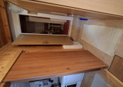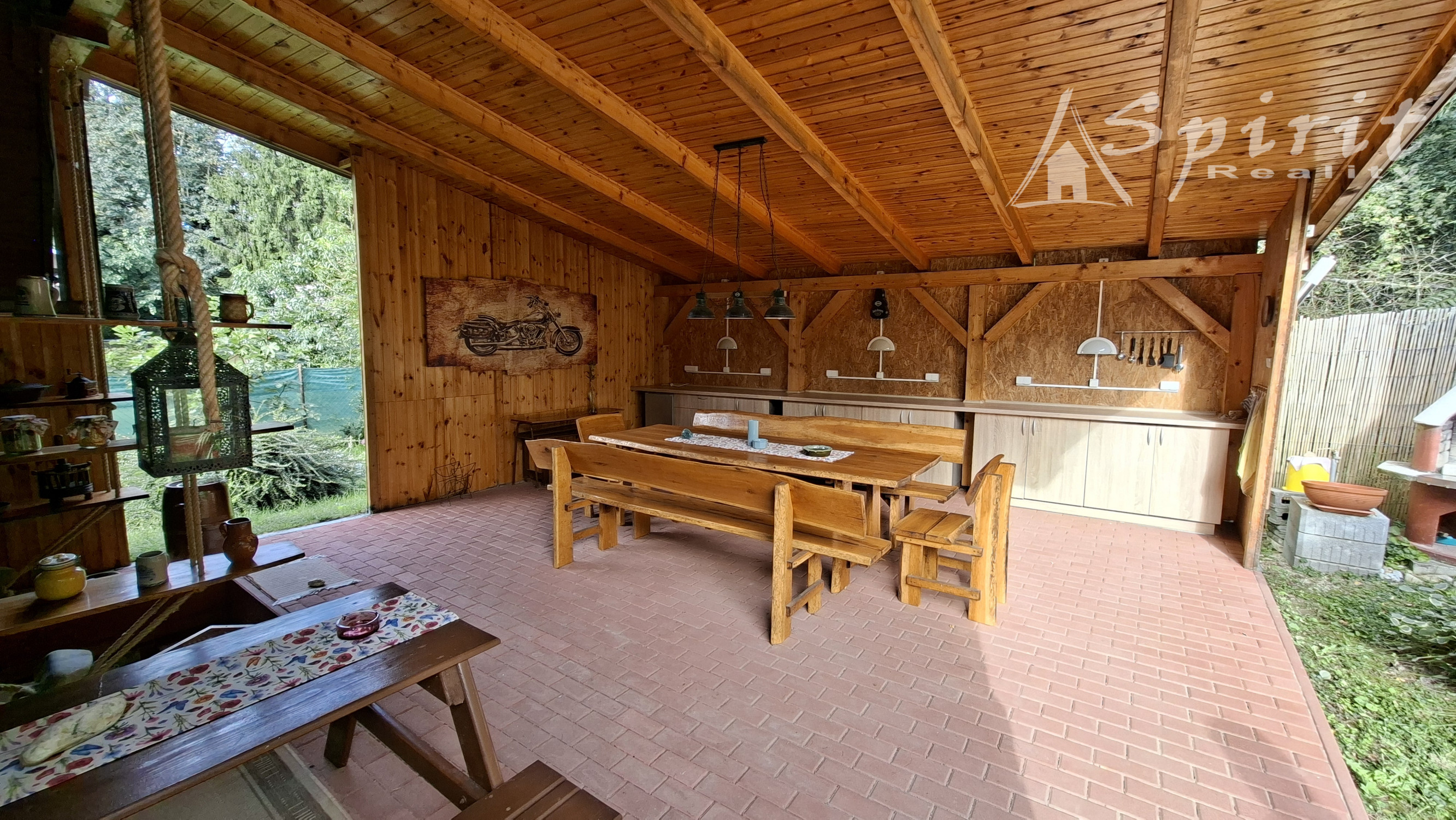 veľký masívny stôl, lavice, stoličky, kuchynská linka, gril a dokonca aj detské drevené sedenie. Vonku vstavaná kuchyňa.