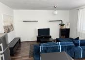 pohodlná sedačka, konferenčný stolík a televízor,