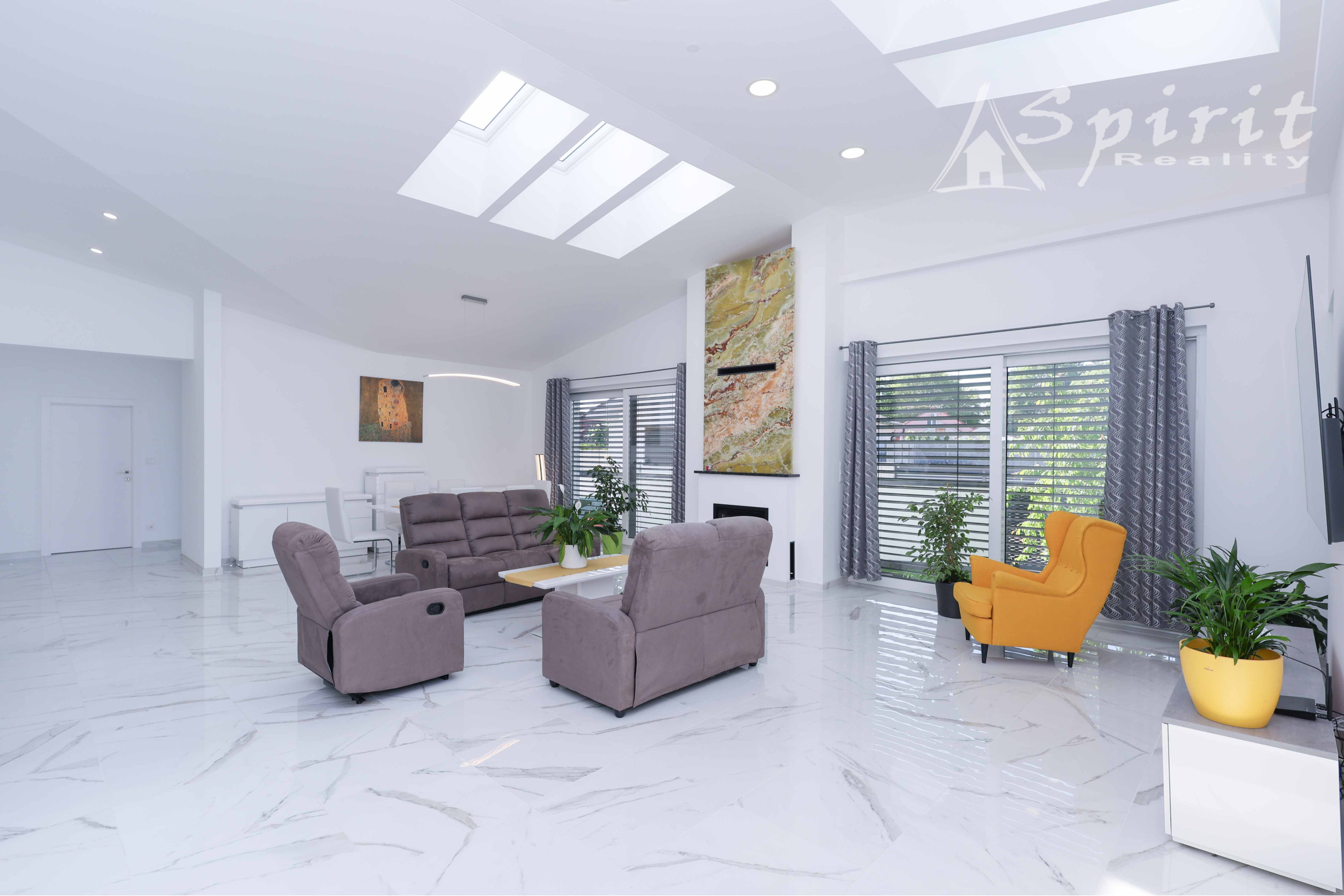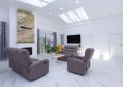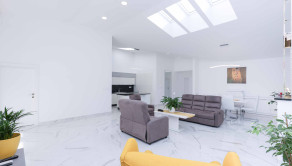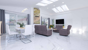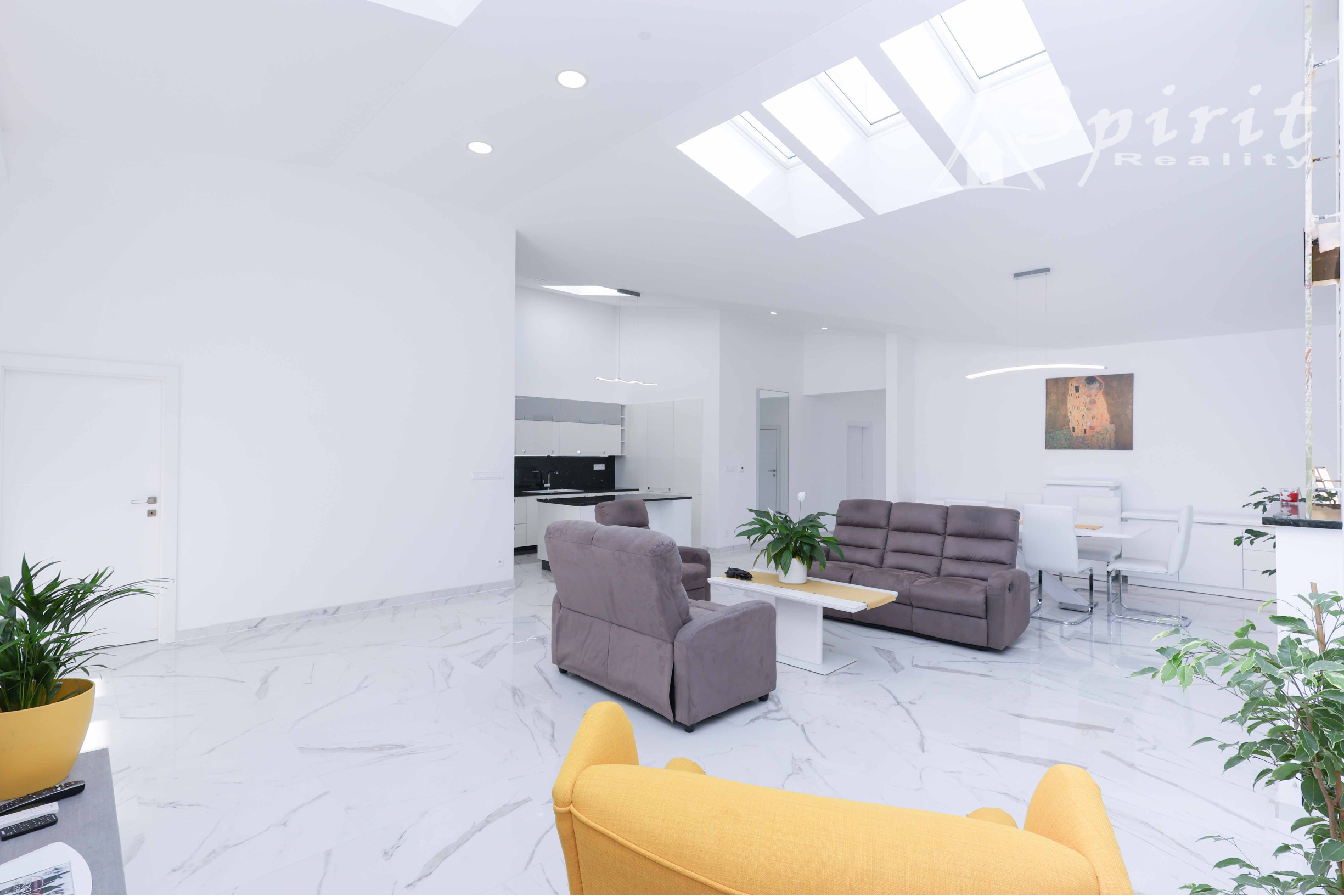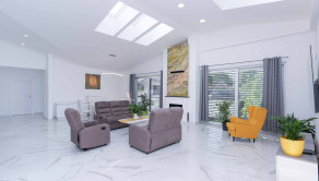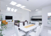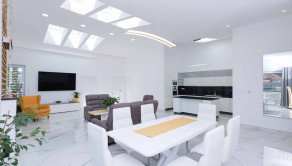 Obývačka a kuchyňa – keramická dlažba, plus svetlíky vo forme strešných okien zn. Velux