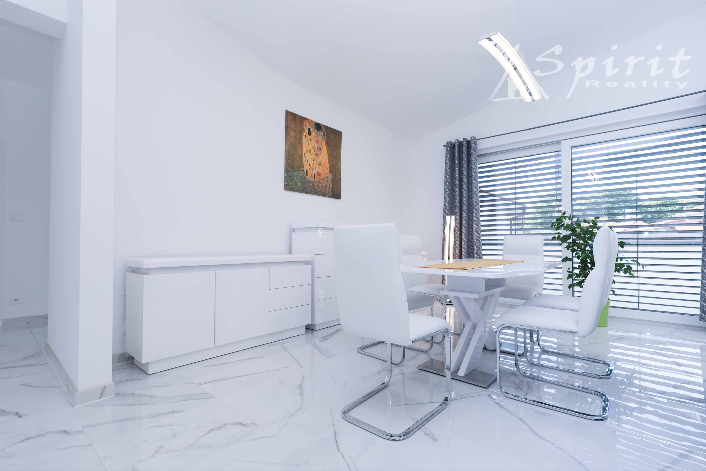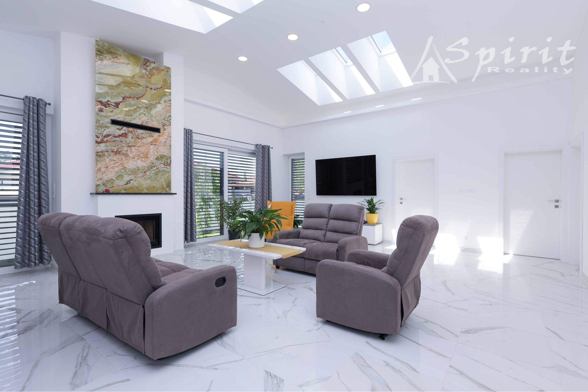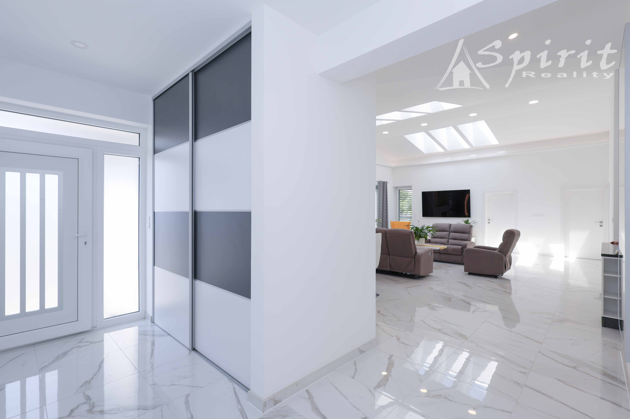 Obývačka a kuchyňa – keramická dlažba, plus svetlíky vo forme strešných okien zn. Velux
