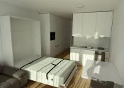 • Štýlové zariadenie, vstupná chodba s priestrannými vstavanými skriňami pre dostatok úložného priestoru. Izba spojená s kuchynskou časťou: