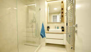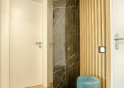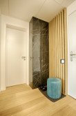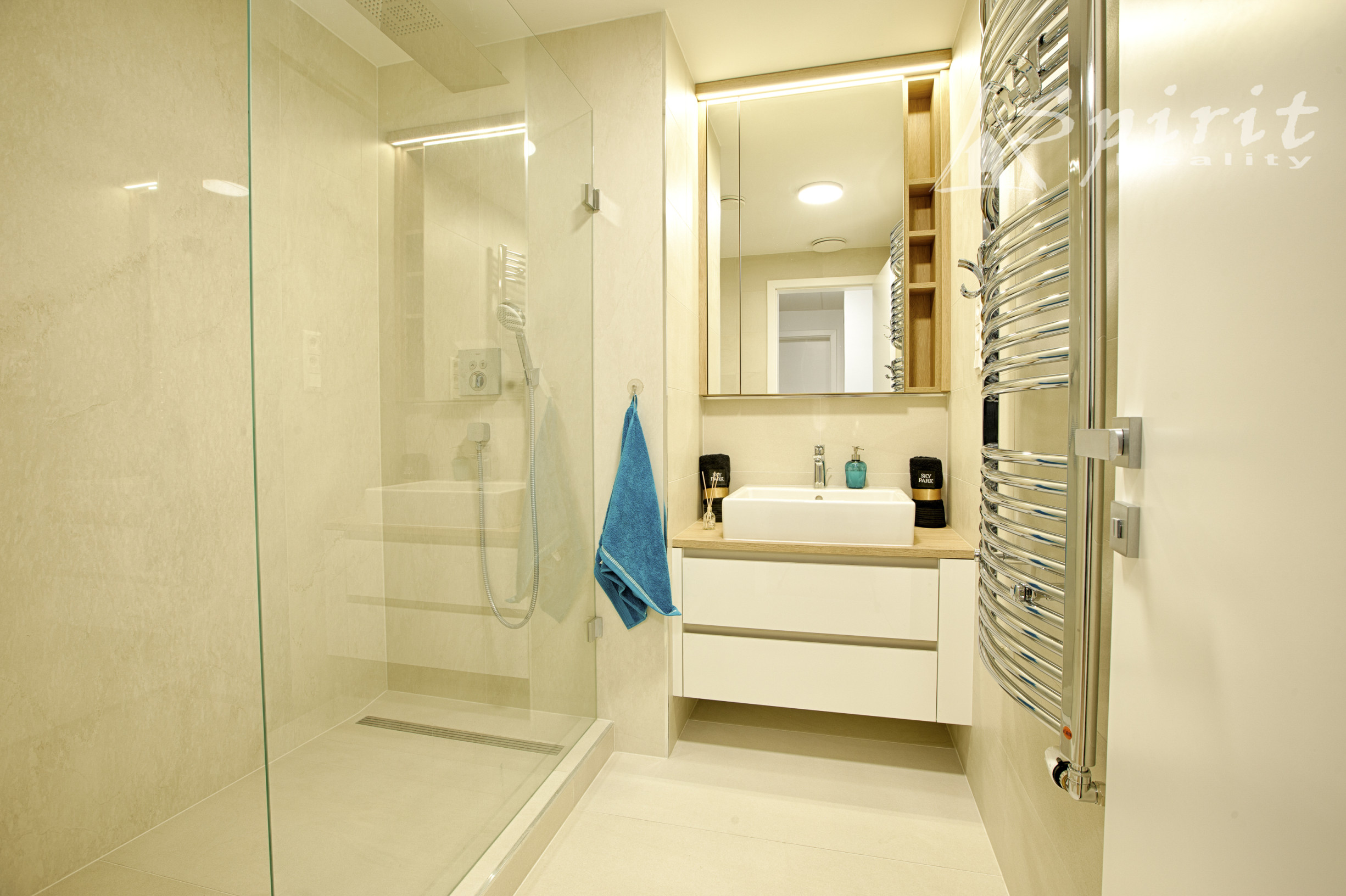 Vstupná hala, kúpeľňa s veľkým priestranným sprchovým kútom, oproti samostatné WC, obývacia izba s jedálenských stolom pri okne s výhľadom na hrad. Spálňa s manželskou posteľou a na mieru vstavanou skriňou. Plus lodžia s posedením.