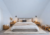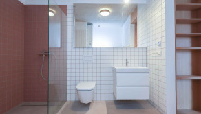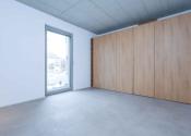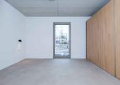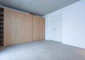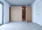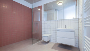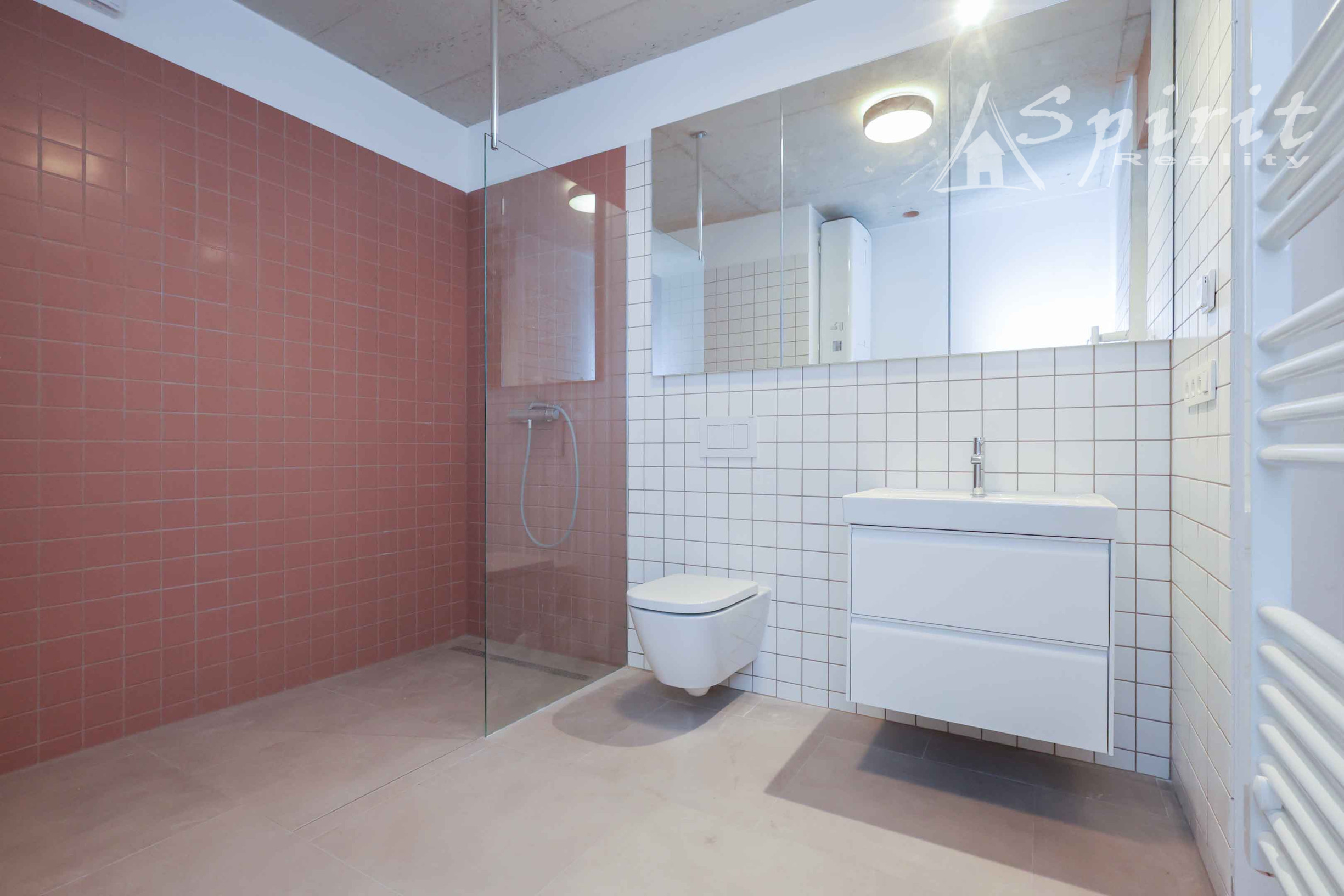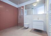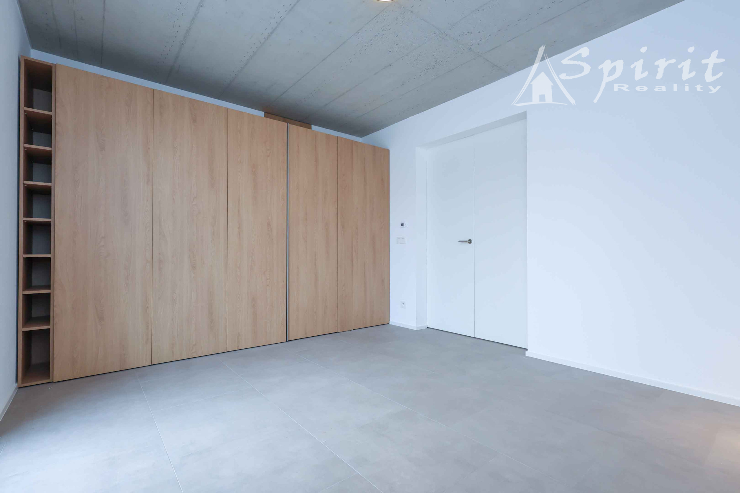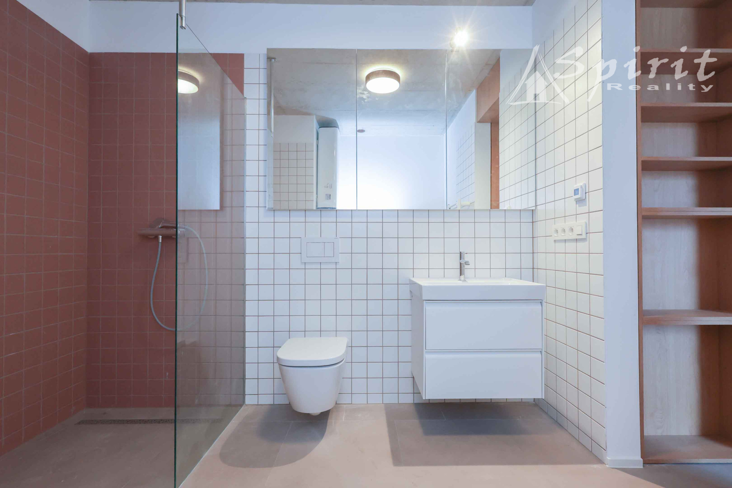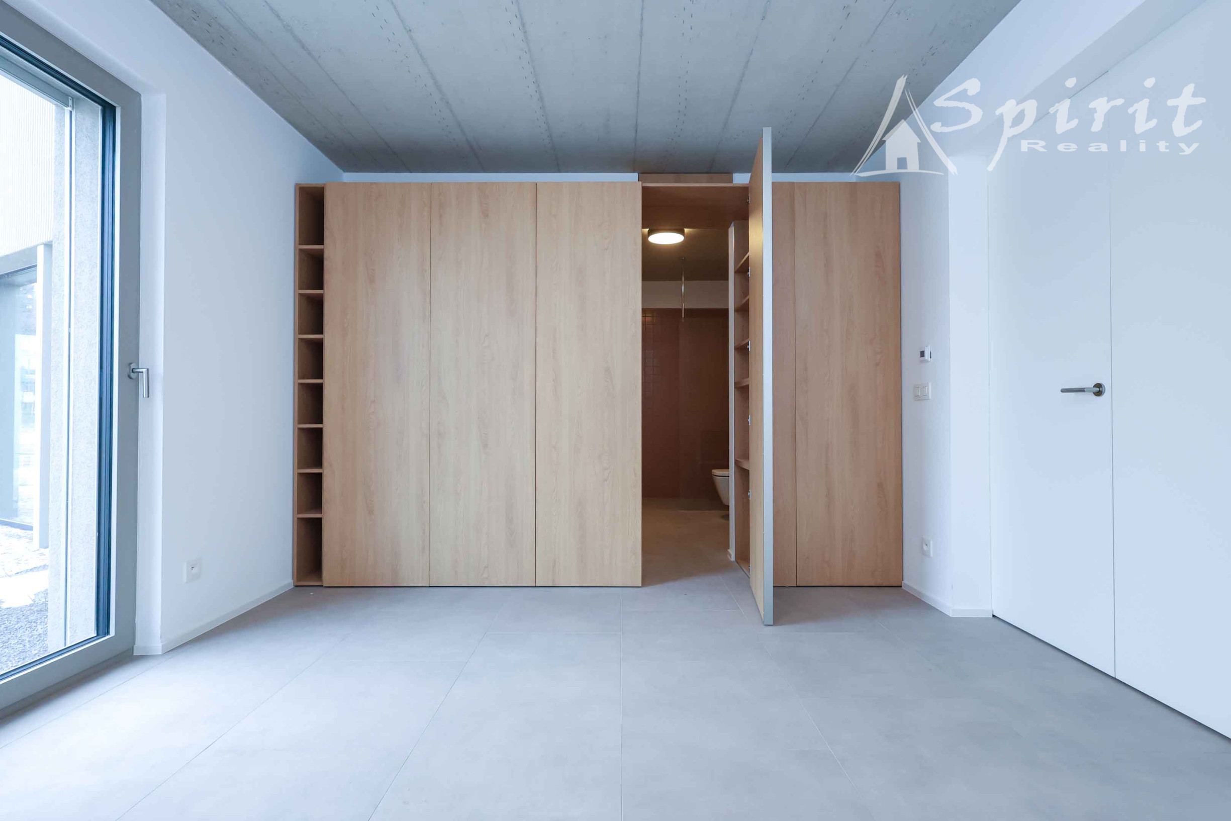 Interiér bytu je navrhnutý v elegantnom štýle s dôrazom na detail. Nová kúpeľňa so sprchovým kútom je riešená veľmi prakticky – vstup do kúpeľne je diskrétne vedený cez vstavané skrine na mieru v spálni, ktoré zároveň poskytujú dostatok úložného priestoru a pôsobia čisto a minimalisticky.