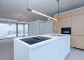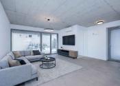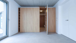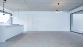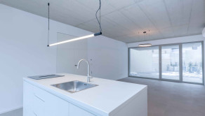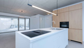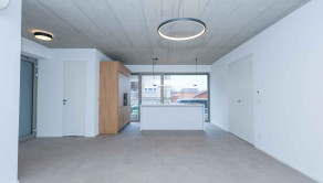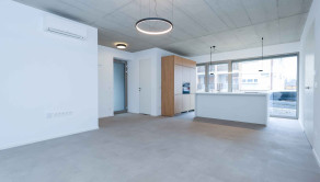 Byt disponuje bezfalcovými interiérovými dverami, ktoré podčiarkujú moderný charakter priestoru. Kuchyňa je kompletne vybavená všetkými spotrebičmi a plynulo nadväzuje na dennú časť bytu. Komfort bývania výrazne zvyšuje elektrické podlahové kúrenie a klimatizácia, vďaka ktorým je v byte príjemná teplota počas celého roka. Pred obývacou izbou sa nachádza veľký šatník.